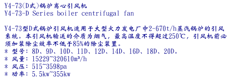 Y4-73型D式鍋爐引風(fēng)機(jī)適用于大型火力發(fā)電廠中2-670t/h蒸汽鍋爐的引風(fēng)系統(tǒng)。本引風(fēng)機(jī)輸送的介質(zhì)為煙氣,最高溫度不得超過(guò)250℃,引風(fēng)機(jī)前必須加裝除塵效率不低于85%的除塵裝置。