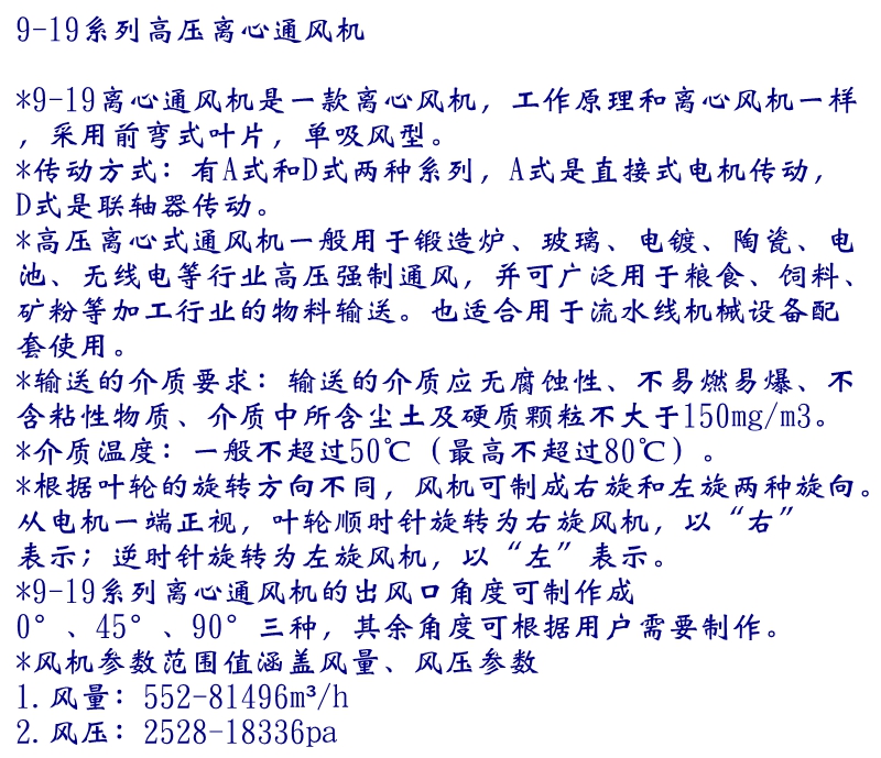 高壓離心式通風機一般用于鍛造爐、玻璃、電鍍、陶瓷、電池、無線電等行業(yè)高壓強制通風,并可廣泛用于糧食、飼料、礦粉等加工行業(yè)的物料輸送。