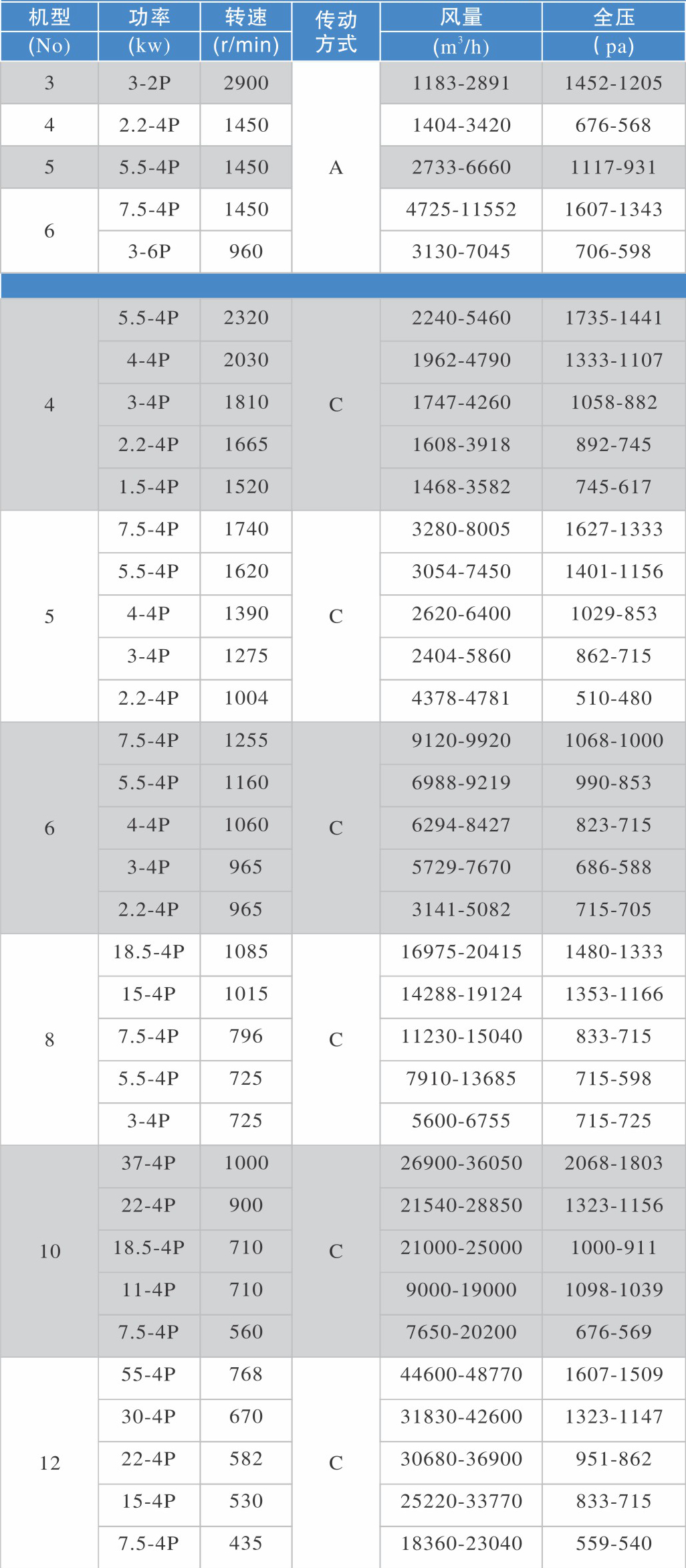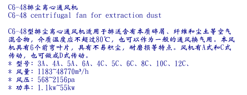 c6-48后傾式工業(yè)離心通風機適用于排送含有本質(zhì)碎屑、纖維和塵土等空氣混合物,介質(zhì)溫度應不超過80℃,也可以作為一般的通風換氣用。本風機具有6個前彎葉片,具有不易積塵,耐磨損等特點。