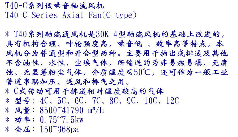 T40-C式系列皮帶傳動(dòng)軸流式通風(fēng)機(jī),主要用于抽出或排送及其他不含油性、水性、塵埃氣體,所輸送的為非易燃易爆、無腐蝕、無顯著粉塵氣體,介質(zhì)溫度≤50℃,還可作為一般工業(yè)管道串聯(lián)加